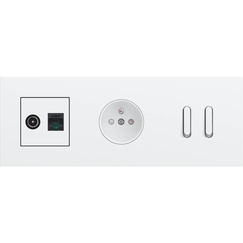 La plaque de recouvrement triple Niko Rocker, horizontale, s'enclenche sur une fonction de 45 x 45 mm, une fonction de prise de courant et une fonction de commutation double that have been horizontally installed next to each other with a centre distance of 71 mm. La plaque de recouvrement se combine avec tout set de finition Niko 45 x 45 mm, set de finition pour prise de courant Niko Rocker et Niko Toggle et set Niko Rocker disponibles pour les fonctions de commutation simple. Elle se compose d'un cadre supérieur, d'un guide lumineux et d'un cadre inférieur qui sont interconnectés mécaniquement. Le cadre supérieur est en acier. Le cadre inférieur est en polycarbonate (PC) blanc + acrylique-styrène-acrylate (ASA), white coated. L'épaisseur du cadre supérieur est de 2 mm, celle du cadre inférieur de 6 mm.