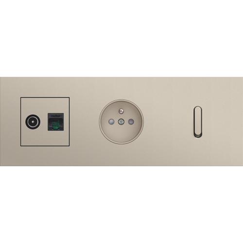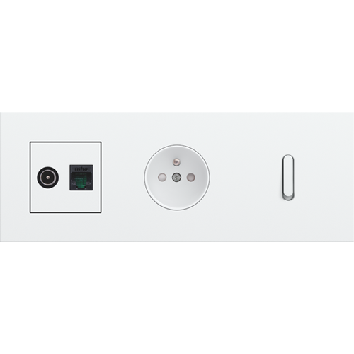 La plaque de recouvrement triple Niko Rocker, horizontale, s'enclenche sur une fonction de 45 x 45 mm, une fonction de prise de courant et une fonction de commutation simple that have been horizontally installed next to each other with a centre distance of 71 mm. La plaque de recouvrement se combine avec tout set de finition Niko 45 x 45 mm, set de finition pour prise de courant Niko Rocker et Niko Toggle et Niko Rocker disponibles pour les fonctions de commutation simple. Elle se compose d'un cadre supérieur, d'un guide lumineux et d'un cadre inférieur qui sont interconnectés mécaniquement. Le cadre supérieur est en acier. Le cadre inférieur est en polycarbonate (PC) blanc + acrylique-styrène-acrylate (ASA), white coated. L'épaisseur du cadre supérieur est de 2 mm, celle du cadre inférieur de 6 mm.