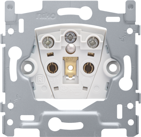 Mécanisme pour un interrupteur permutateur, 10 AX/250 Vac. Le socle est équipé de fixation par vis et de bornes à connexion rapide. Le socle a une profondeur de montage de 26 mm. Un interrupteur permutateur peut être utilisé pour faire fonctionner une lampe à partir de trois endroits ou plus. Un Niko Rocker ou un Niko Toggle et la plaque de recouvrement d’une couleur au choix doivent être commandés séparément.