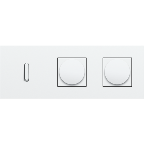 La plaque de recouvrement triple Niko Rocker, horizontale, s'enclenche sur une fonction de commutation simple et deux fonctions de 45 x 45 mm that have been horizontally installed next to each other with a centre distance of 71 mm. La plaque de recouvrement se combine avec toute barre Niko Rocker disponible pour les fonctions de commutation simple et set de finition Niko 45 x 45 mm. Elle se compose d'un cadre supérieur, d'un guide lumineux et d'un cadre inférieur qui sont interconnectés mécaniquement. Le cadre supérieur est en acier. Le cadre inférieur est en polycarbonate (PC) blanc + acrylique-styrène-acrylate (ASA), white coated. L'épaisseur du cadre supérieur est de 2 mm, celle du cadre inférieur de 6 mm.