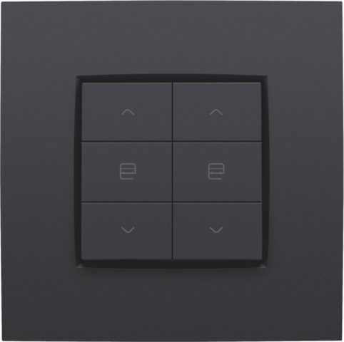La commande de moteur double possède deux groupes de trois boutons d’action. L’habitant peut ainsi commander les moteurs de deux groupes de volets, stores ou stores vénitiens. Le bouton-poussoir se fixe sur la platine murale au moyen d’un mécanisme à encliqueter.