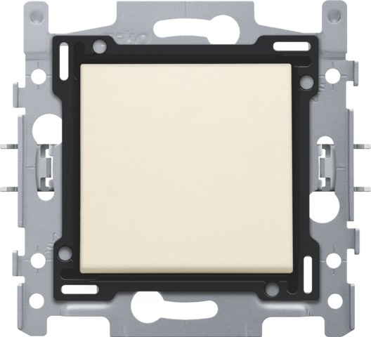 Afwerkingsset voor enkelvoudige schakelaar of drukknop, cream. De centraalplaat is omringd door een vlakke boord die op de 4 hoeken voorzien is van een rechthoekige opening, waarin zich telkens een multipositionele snaphaak bevindt. De opbouw van de centraalplaat zorgt ervoor dat bij onzorgvuldig pleisterwerk de afdekplaat steeds vlak tegen de muur bevestigd kan worden dankzij de snaphaken. Dit werkt in twee richtingen: als de inbouwdoos uit het pleisterwerk steekt, vangen de multipositionele snaphaken een speling tussen 1 Ã 1,2 mm op; als de inbouwdoos te diep in het pleisterwerk verzonken is, dan kunnen de snaphaken een speling tot 1,8 mm opvangen. De vlakke boord rondom de centraalplaat bevat eveneens 4 ronde openingen die ervoor zorgen dat de afdekplaat correct gepositioneerd kan worden ten opzichte van de centraalplaat. Na montage van het geheel (afdekplaat, afwerkingsset en mechanisme) zijn er, dankzij de vlakke boord aan de centraalplaat, geen metalen delen zichtbaar.