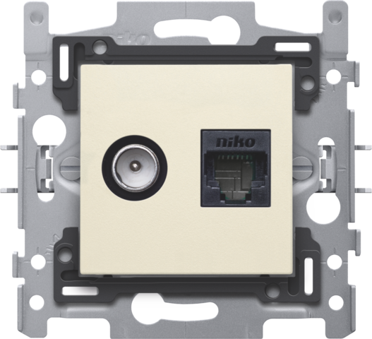 Dit mechanisme met RJ45-aansluitpunt UTP Cat. 6A en coaxaansluiting dient om netwerkverbinding te maken voor telefonie, Ethernet, IP of internettoepassingen. Alle aansluitpunten van het mechanisme worden in sterconfiguratie aangesloten op de centrale aansluitkast met behulp van een kabel van hetzelfde performantietype. De sokkel heeft binnenafmetingen van 45 x 45 mm en buitenafmetingen van 60 x 71 mm en is voorzien van klauwbevestiging. Afwerkingskleur: cream. Goedgekeurd Wyre (Telenet-Interkabel) en VOO.