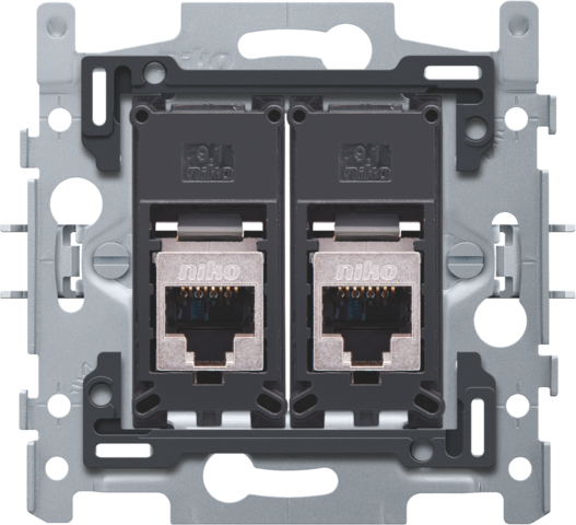 Dit mechanisme met 2 RJ45-aansluitpunten STP Cat. 6, in vlakke uitvoering, dient om netwerkverbinding met 2 apparaten te maken voor telefonie, Ethernet, IP of internettoepassingen. Door de hoogwaardige kwaliteit biedt dit type bovendien de mogelijkheid om distributie tv-signalen door te sturen voor analoge, digitale en interactieve tv-beelden. Het mechanisme wordt in sterconfiguratie aangesloten op de centrale aansluitkast met behulp van een kabel van hetzelfde performantietype. De afscherming zorgt voor een storingsbestendigere verbinding. De sokkel heeft binnenafmetingen van 45 x 45 mm en buitenafmetingen van 60 x 71 mm en is uitgerust met klauwbevestiging. Een afwerkingsset in een kleur naar keuze moet afzonderlijk besteld worden.