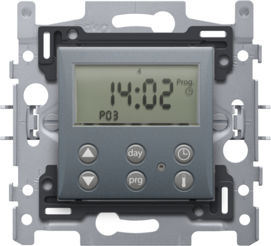 De digitale klokthermostaat met intelligente regeling en schakelcontact 1 A potentiaalvrij, 230 V is uitermate geschikt voor temperatuursturing. Hij omvat een dag- en weekprogramma en een permanent geheugen. Hij is voorzien van een afwerkingsset in kleur en geschikt voor klauwbevestiging. De afdekplaat dient afzonderlijk besteld te worden. Afwerkingskleur: blue grey coated.