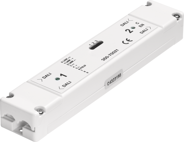 Met deze DALI-linkmodule kan je meerdere DALI-bussen met elkaar koppelen en wordt het mogelijk om ruimtes gescheiden door vouwdeuren te sturen, aangrenzende ruimtes te sturen of installaties met meer dan het maximumaantal van 64 DALI-units per bus te bedienen. De module is door zijn design eenvoudig te integreren in de installatie en vereist geen 230V-voeding.