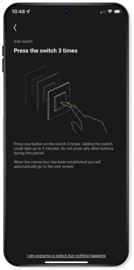 Druk 3 keer kort na elkaar op de bedieningsknop van de schakelaar om een signaal te sturen naar de Niko Home app, zodat je die schakelaar kunt toevoegen.