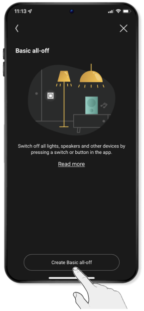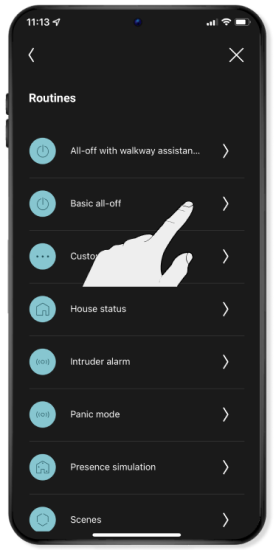 Je kunt een routine programmeren zoals een 'standaard alles uit' routine, waarmee je met één druk op een bedieningsknop (of via de app) alle verlichting kunt doven wanneer je bijvoorbeeld de woning verlaat.