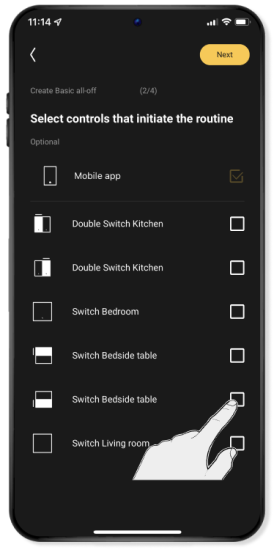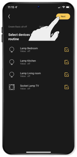Selecteer de toestellen die moeten uitgaan als je de 'standaard alles uit' routine inschakelt. Klik vervolgens op Verder.