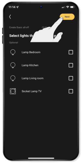 Selecteer eventueel enkele lampen die langer moeten blijven branden nadat je de 'alles uit' routine hebt ingeschakeld.