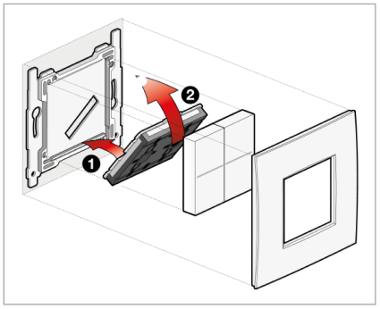 Schuif de schakelaar in de onderkant van de sokkel ❶ en klik vervolgens debovenkant vast ❷. Plaats ten slotte de afwerkingsset en de afdekplaat (afzonderlijk te kopen).