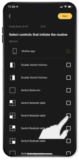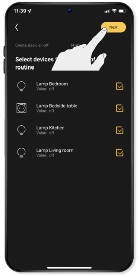 Selecteer de toestellen die moeten uitgaan als je de 'standaard alles uit' routine inschakelt. Klik vervolgens op Verder.