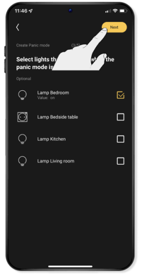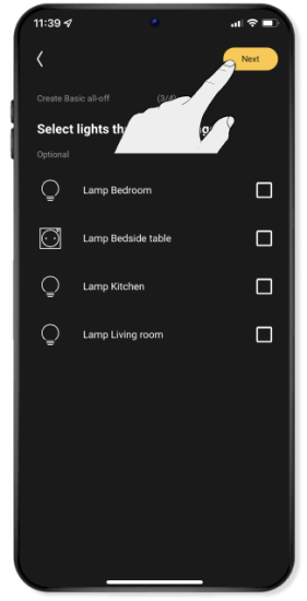 Selecteer eventueel enkele lampen die langer moeten blijven branden nadat je de 'alles uit' routine hebt ingeschakeld.