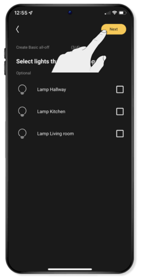 Je kunt een routine programmeren zoals een 'standaard alles uit' routine waarmee je met één druk op een bedieningsknop (of via de app) alle verlichting kunt doven wanneer je bijvoorbeeld de woning verlaat.