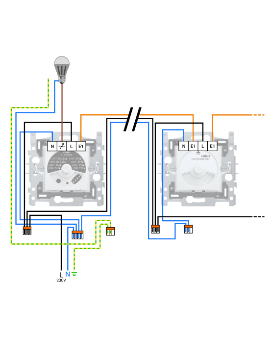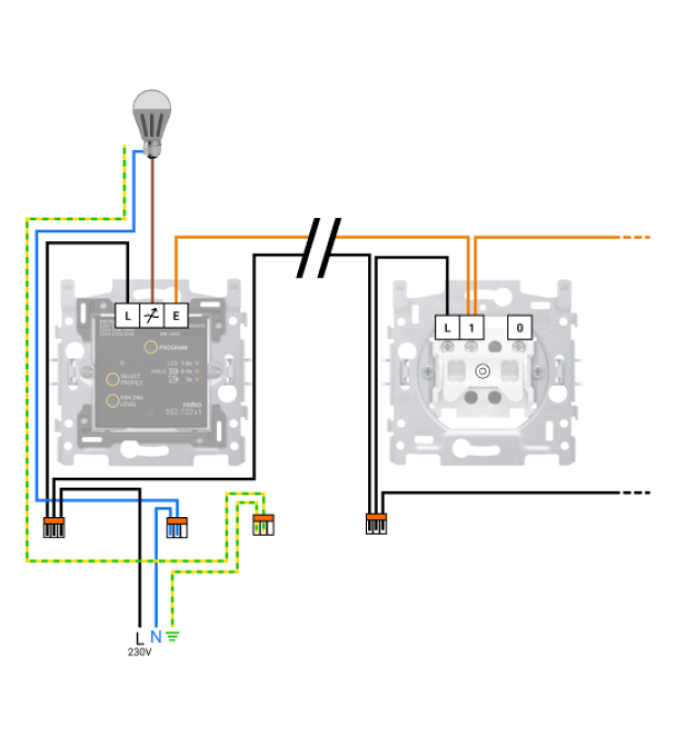 Let op: Sluit de geconnecteerde dimmer altijd rechtstreeks aan op de lamp.