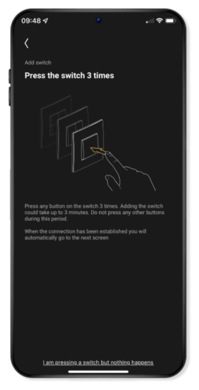 Na 3 keer drukken op de dimknop gaat de blauwe led op de dimmer knipperen. Dit kan 5 minuten duren. Zodra de koppeling tot stand is gebracht, brandt de blauwe led van de dimmer continu gedurende 4 seconden. Je gaat dan automatisch naar het volgende scherm in de app.