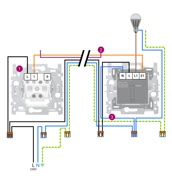 Je hebt een extra draad❶ nodig, omdat je de nulleider moet aansluiten op de geconnecteerde schakelaar. Eén van de schakeldraden die nodig waren om de wisselschakelaars te koppelen, gebruik je niet meer ❷. Op de extensieuitgang van de geconnecteerde schakelaar sluit je een klassieke drukknop aan ❸. Je vervangt dus beide wisselschakelaars.