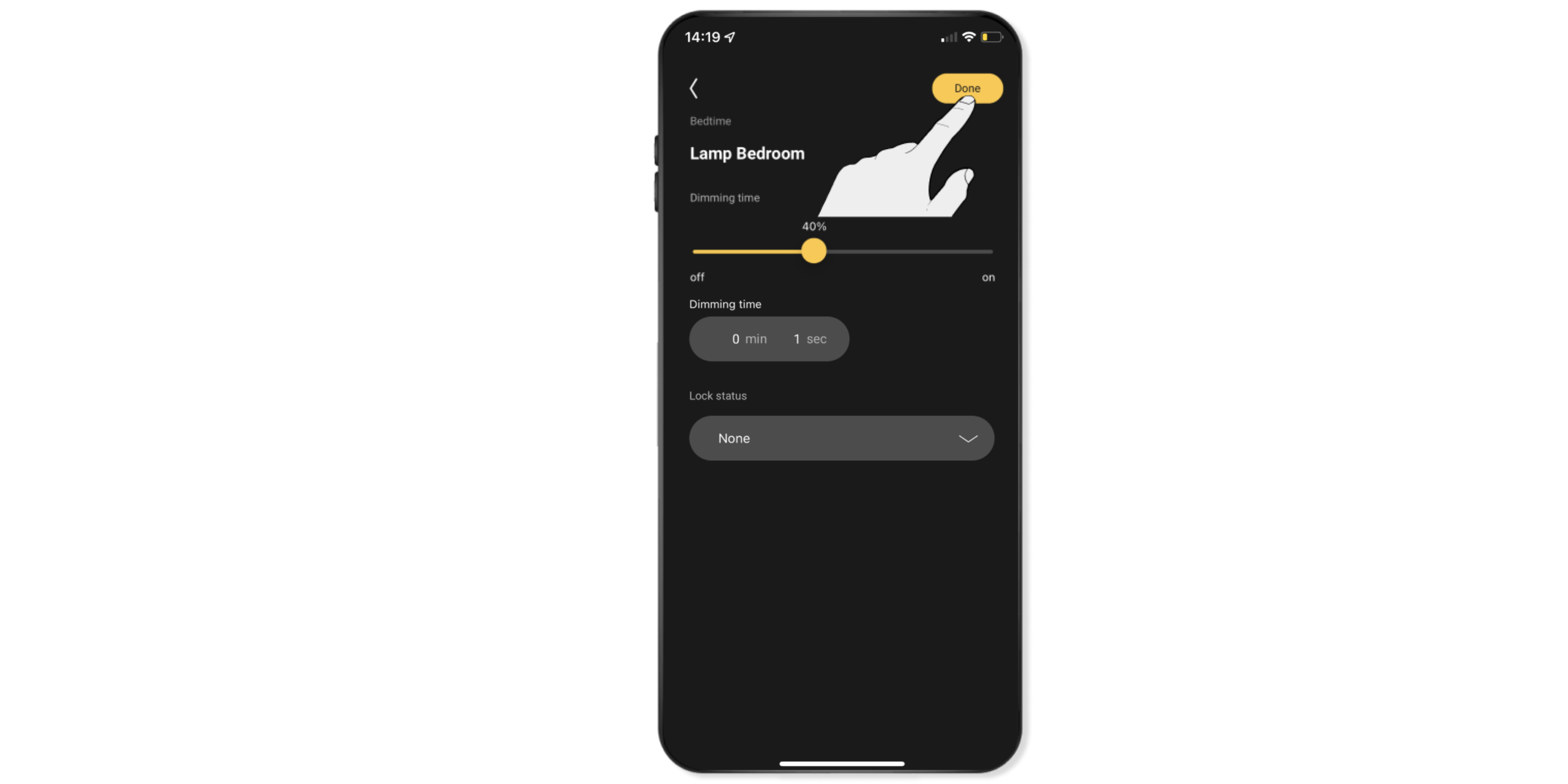 Voorbeeld: Je kunt de verlichting in de slaapkamer laten dimmen naar 40% door de schuifregelaar naar links te schuiven.