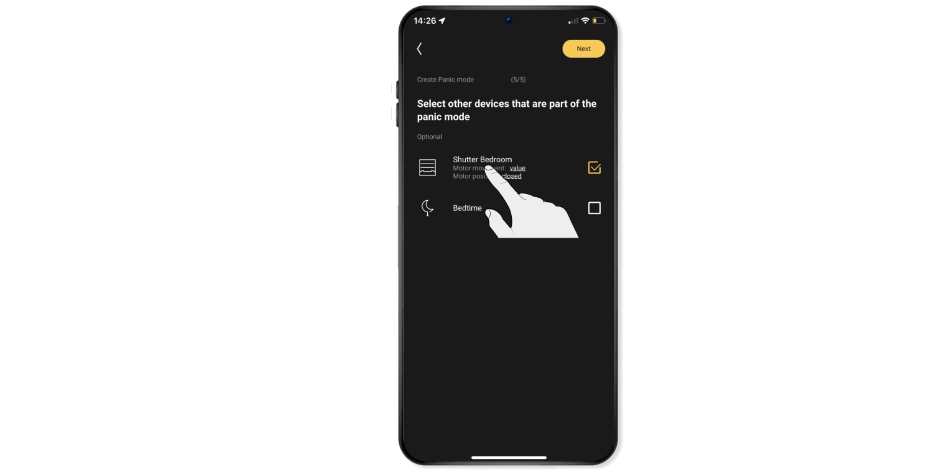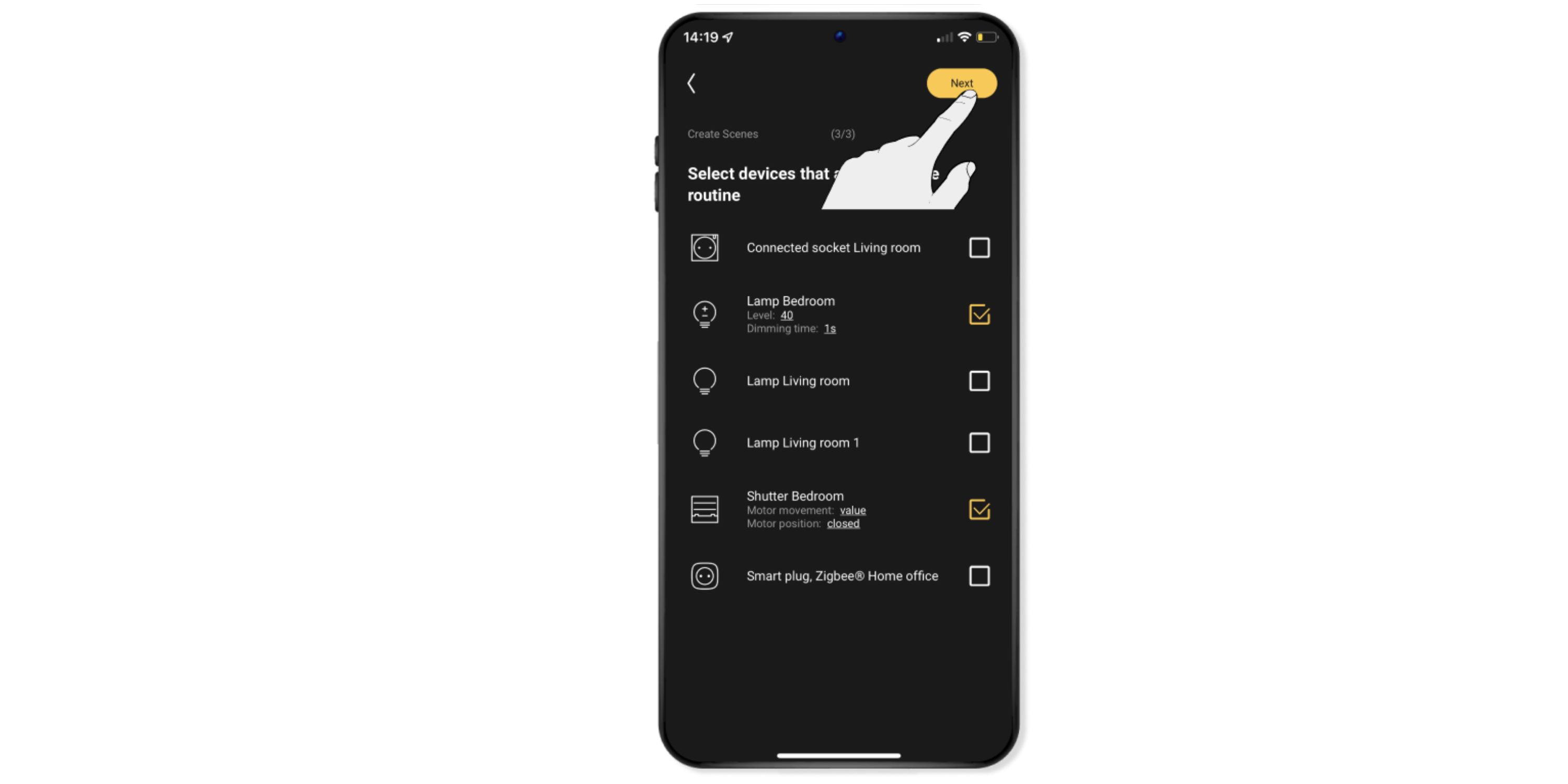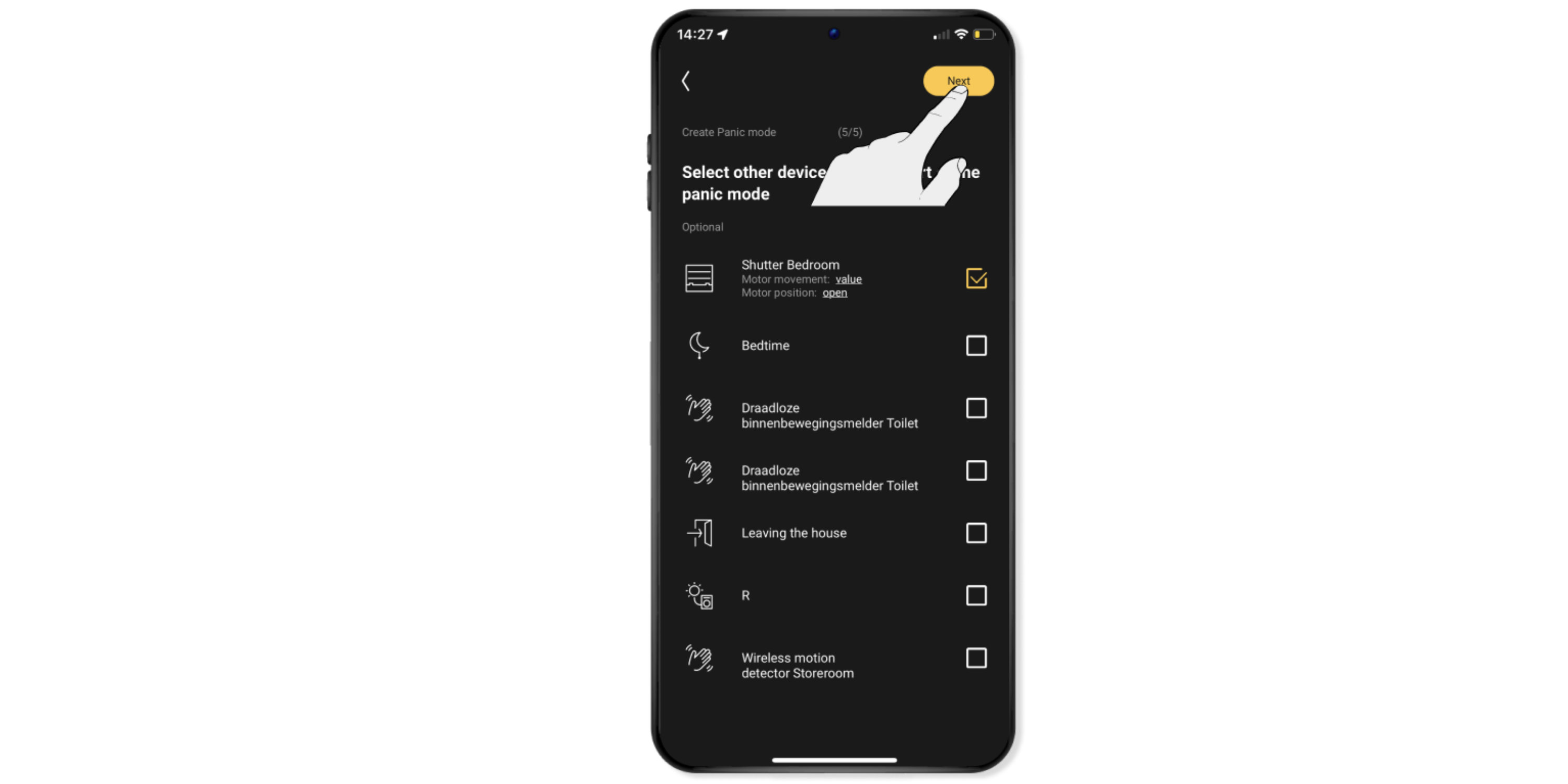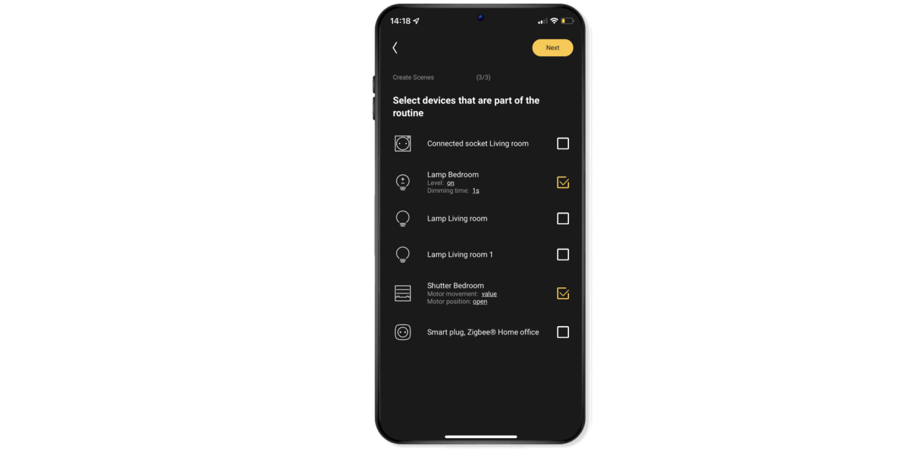 Selecteer het rolluik (of zonwering) en eventueel andere toestellen en lampen die je in de sfeer wilt gebruiken.