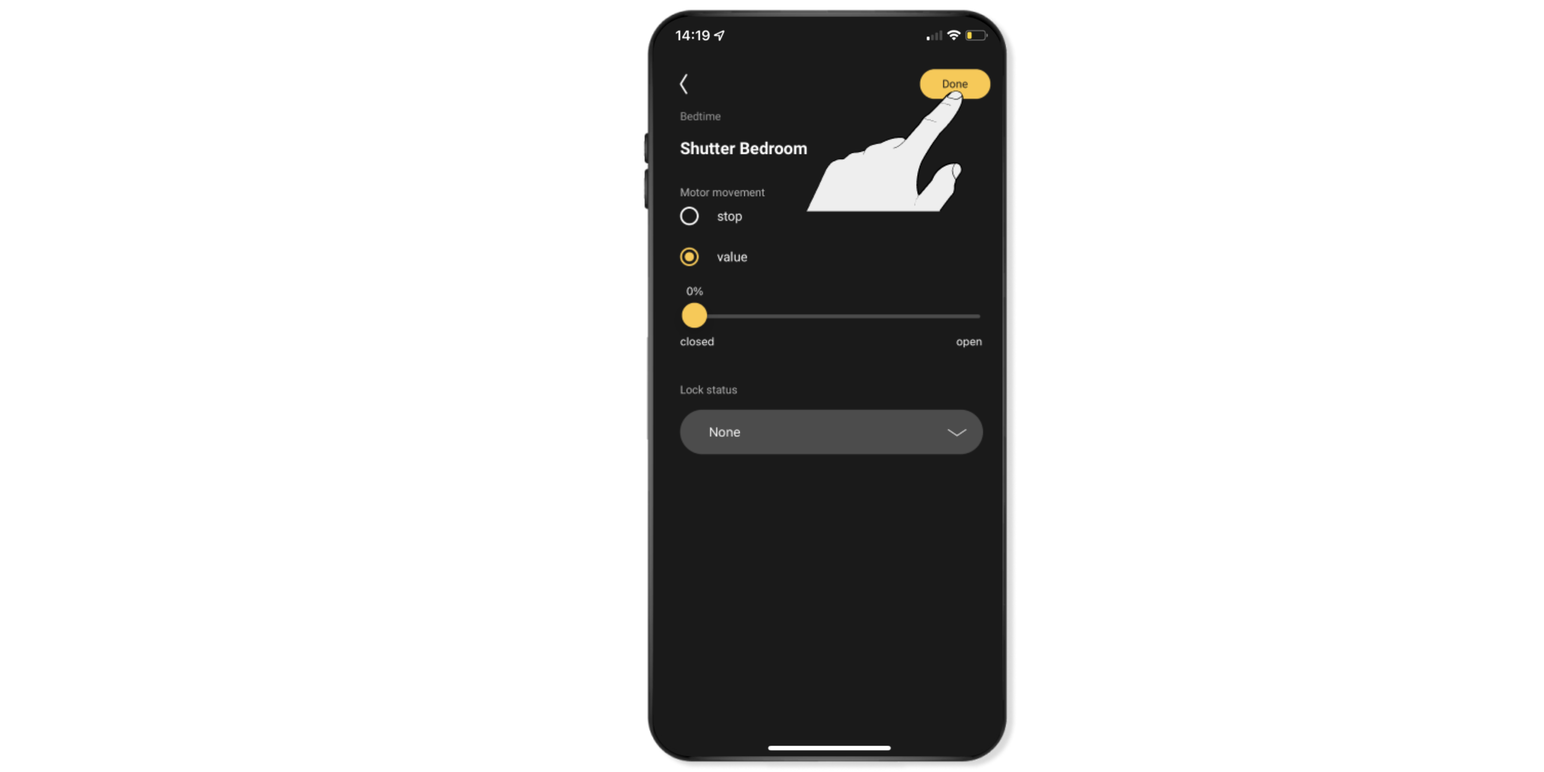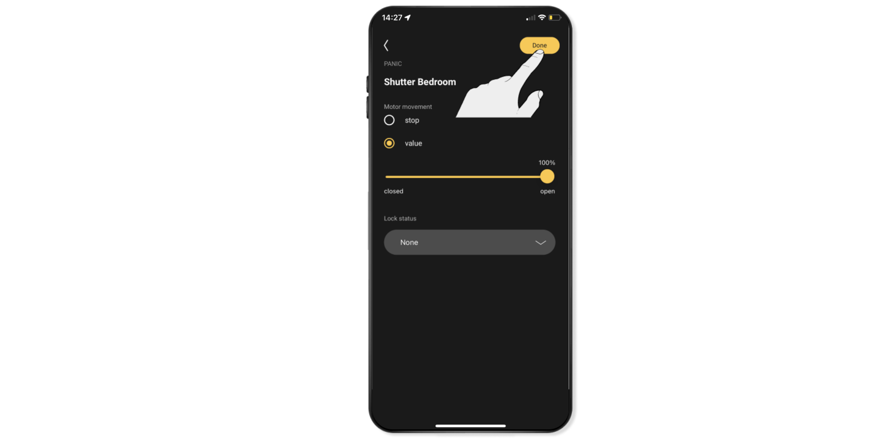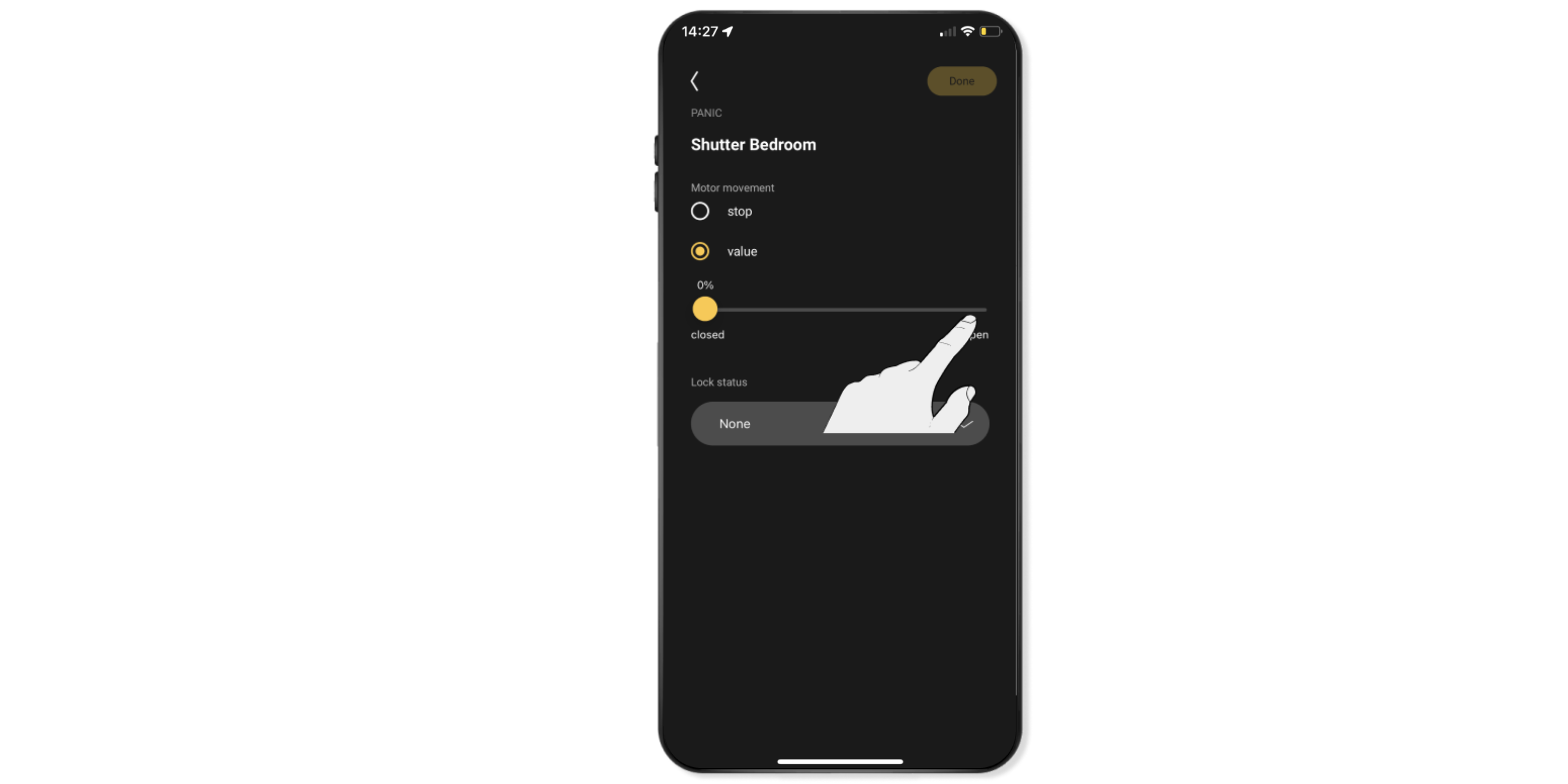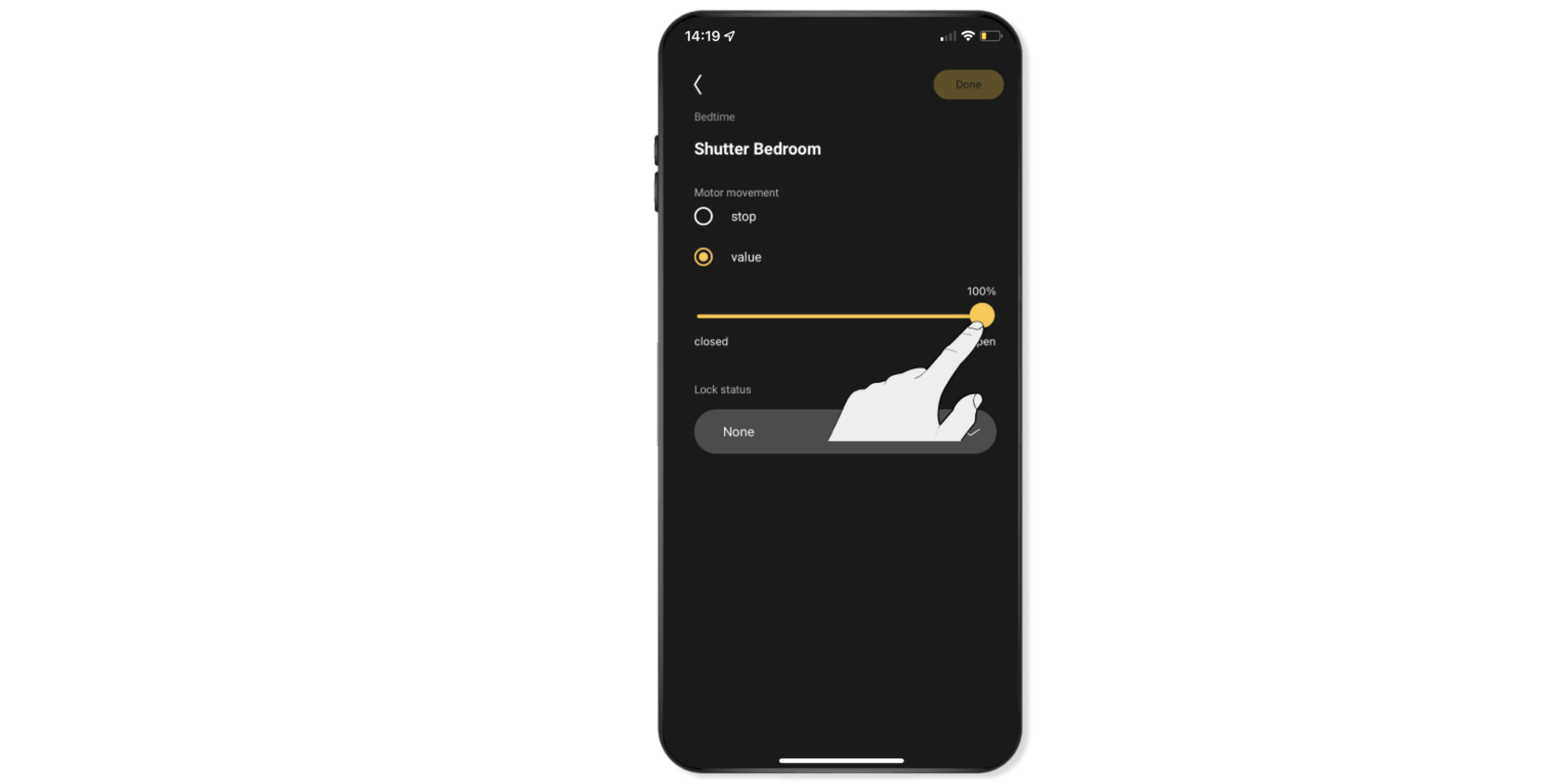 Voorbeeld: Je kunt het rolluik volledig laten sluiten door de schuifregelaar volledig naar links te schuiven.