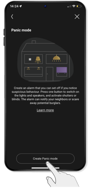 Je kunt een waarschuwingsmodus programmeren waarmee je de rolluiken kunt laten opengaan en de verlichting op een ingesteld ritme laat in- en uitschakelen. Op die manier kun je de buren alarmeren of eventuele inbrekers afschrikken als je iets verdachts hoort of ziet.