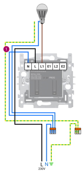 Je hebt een extra draad❶ nodig, omdat je de nulleider moet aansluiten op de geconnecteerde schakelaar (je kunt ook doorlussen via de N-klem). De L2-klem mag vrij blijven, want je sluit maar één lichtpunt aan. De E1-klem en E2-klem mogen ook vrij blijven, want die gebruik je alleen in een wissel- of kruisschakeling om klassieke drukknoppen aan te sluiten op de geconnecteerde schakelaar.