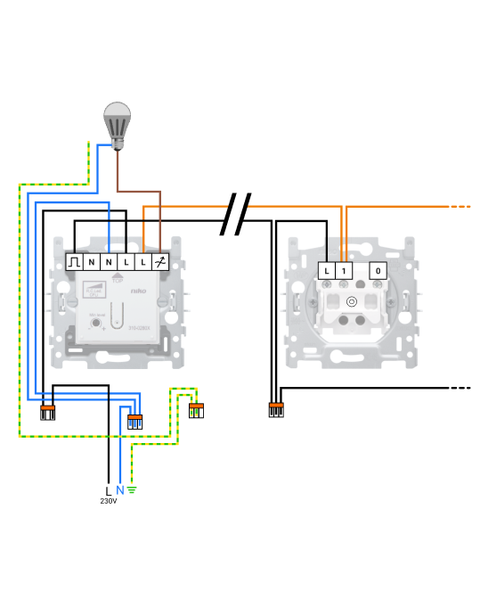 Sluit de fasedraad ❶ via de aansluitklem aan op de klassieke drukknop. Je kunt de nuldraad weglaten ❷, want die is niet nodig in een geconnecteerde dimmer.