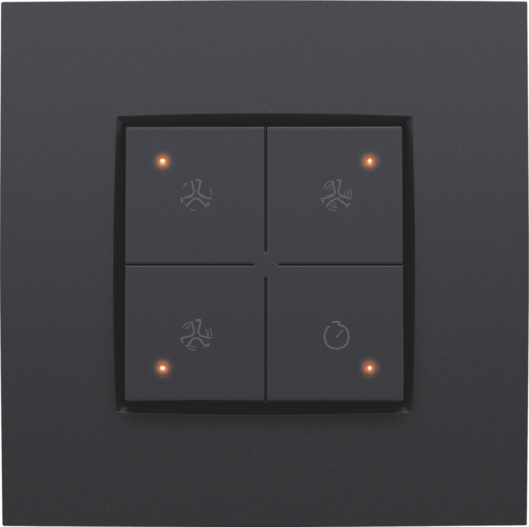 De drukknop heeft vier actieknoppen: een voor elke instelling van het centrale ventilatiesysteem (laag, normaal en hoog) en een boostknop die de hoogste instelling gedurende een vooraf ingestelde tijd activeert voordat de installatie terugkeert naar de vorige instelling. Elke actieknop is voorzien van een amberkleurige indicatieled om de status van de bediening aan te geven. Je bevestigt de drukknop via een klikmechanisme op een muurprint.