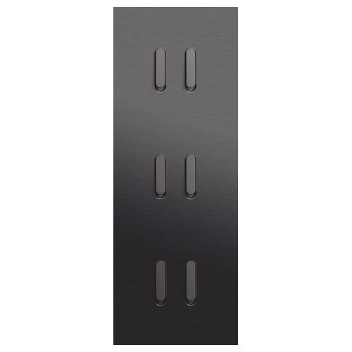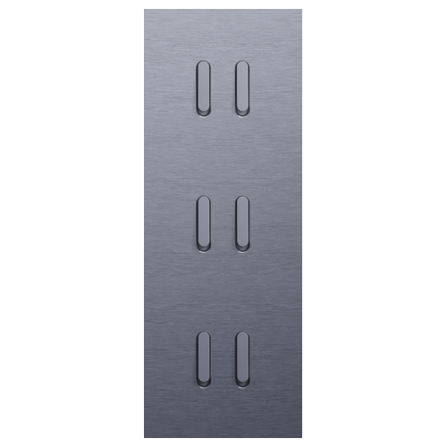 De verticale en drievoudige Niko Rocker afdekplaat klikt op drie tweevoudige schakelfuncties die horizontaal naast elkaar zijn geplaatst met een centerafstand van 71 mm. De afdekplaat past op elke beschikbare Niko Rocker tweevoudige schakelfunctie. Ze bestaat uit een bovenkader, een lichtgeleider en een onderkader die mechanisch met elkaar verbonden zijn. Het bovenkader is vervaardigd uit staal. Het onderkader is vervaardigd uit witte polycarbonaat (PC) + acrylaat-styreen-acrylaat (ASA), white coated. Het bovenkader is 2 mm dik en het onderkader 6 mm.