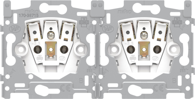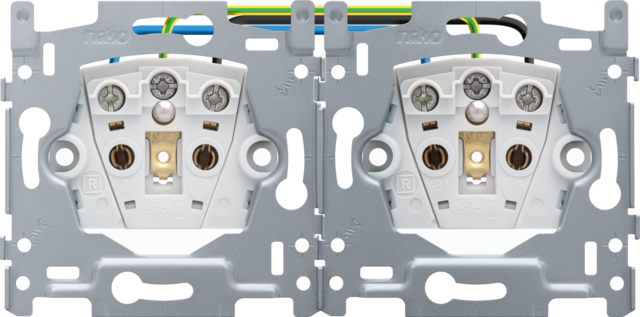 Sokkel voor dubbel stopcontact horizontaal met penaarde en beschermingsafsluiters, inbouwdiepte 28,5 mm, schroefklemmen.