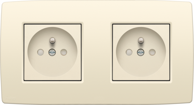 Samengesteld dubbel stopcontact met penaarde (sokkel, centraalplaat en afwerkingsset) voor horizontale plaatsing. De sokkels zijn uitgerust met schroefklemmen en schroefbevestiging. Het stopcontact heeft ook een beschermingsafsluiters en een inbouwdiepte van 28,5 mm. Afwerkingskleur: cream
