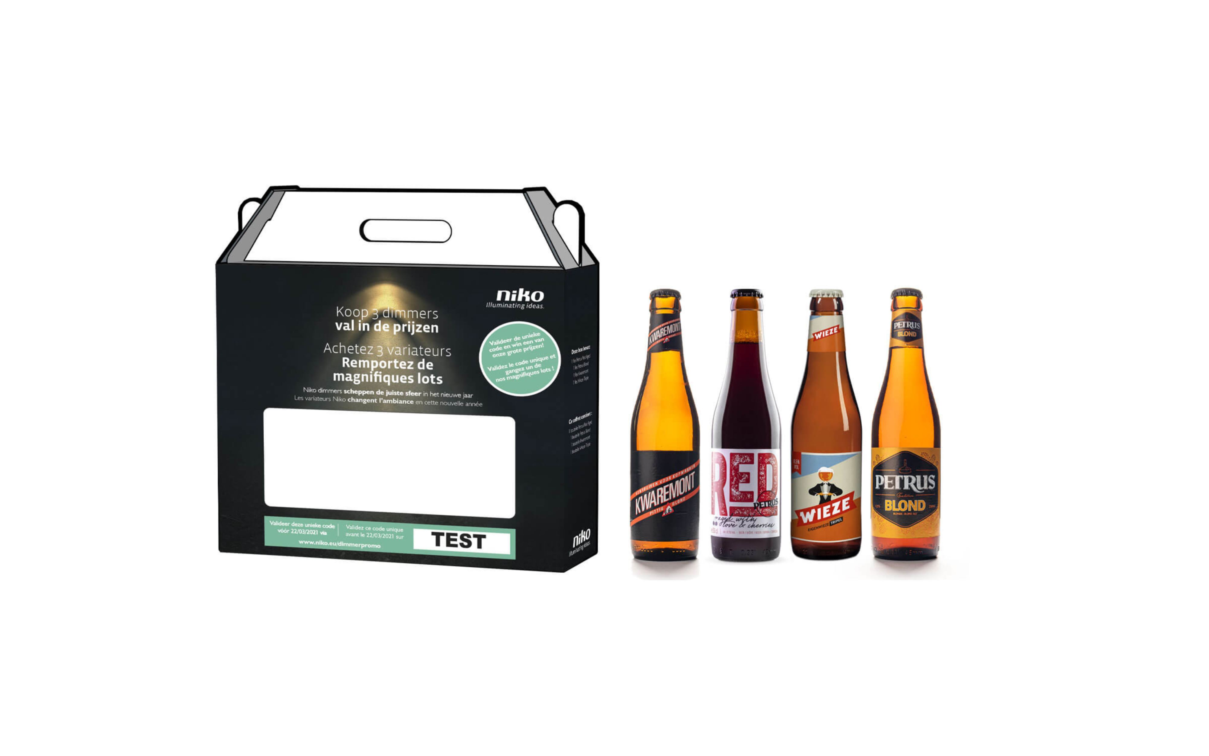 Koop tussen 15 januari en 28 februari 2021 3 dimmers, uit een selectie van 5, en ontvang een pakket met 4 speciaalbieren (RED, Petrus Blond, Kwaremot en Wieze) en maak zo kans op één van de grote prijzen uit Niko's grote prijzenpot.
