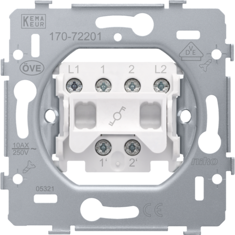 Mechanisme voor een tweepolige wisselschakelaar, met schroefbevestiging. Wisselschakelaars gebruik je om één lamp van op twee verschillende plaatsen te bedienen. Een afwerkingsset en een afdekplaat in een kleur naar keuze moet afzonderlijk besteld worden.