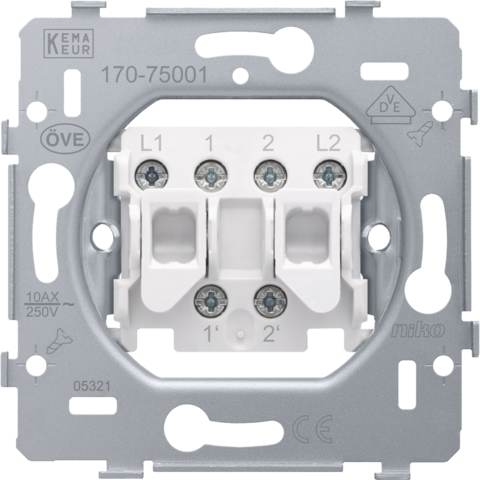 Mechanisme voor een drukknop N.O. of N.G. met twee toetsen, met schroefbevestiging. Een afwerkingsset en een afdekplaat in een kleur naar keuze moet afzonderlijk besteld worden.