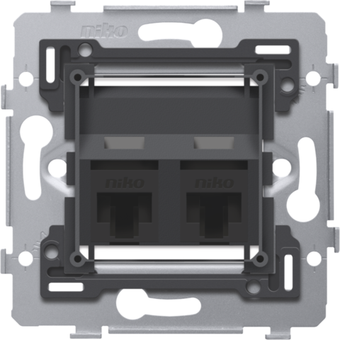 Dit mechanisme met 2 RJ45-aansluitpunten UTP Cat. 6A, in schuine uitvoering, dient om netwerkverbinding met 2 apparaten te maken voor telefonie, Ethernet, IP of internettoepassingen. Elk van de aansluitpunten van het mechanisme wordt in sterconfiguratie aangesloten op de centrale aansluitkast met behulp van een kabel van hetzelfde performantietype. De sokkel heeft binnenafmetingen van 45 x 45 mm en buitenafmetingen van 71 x 71 mm and is uitgerust met schroefbevestiging. Een afwerkingsset in een kleur naar keuze moet afzonderlijk besteld worden.
