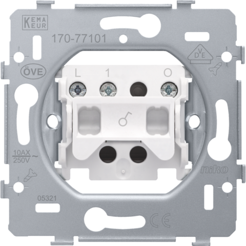 Mechanisme voor een enkelpolige controleschakelaar met 3 aansluitklemmen, met schroefbevestiging. Deze schakelaar kan uitgerust worden met een controlelampje (zie toebehoren voor ledverlichtingselementen) dat aangeeft of het licht nog brandt of niet. Een afwerkingsset en een afdekplaat in een kleur naar keuze moet afzonderlijk besteld worden.