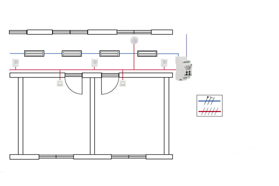 De installatie heeft één zone voor aan/uit-daglichtsturing. Alle verlichtingsarmaturen zijn voorzien van niet-dimbare drivers. Voor optimale detectie zijn er verschillende bewegingsmelders geïnstalleerd.