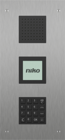 Deze modulaire inbouwbuitenpost (inclusief metalen inbouwdoos) is afgewerkt met een 3 mm dikke frontplaat van geborsteld staal. Hij is voorzien van een luidsprekermodule, een lcd-displaymodule en een toetsenklaviermodule. Op de displaymodule kan je met de 'pijl omhoog'- en 'pijl omlaag'-toetsen van het toetsenklavier de naam van een bewoner selecteren uit de alfabetische bewonerslijst, met de ABC toets een bewoner zoeken op de eerste letter van zijn naam en met de numerieke toetsen zoeken op het flatnummer. Deze buitenpost is geschikt voor installaties tot 1000 wooneenheden. Heb je meer informatie en/of projectondersteuning nodig? Aarzel dan niet om Niko te contacteren.