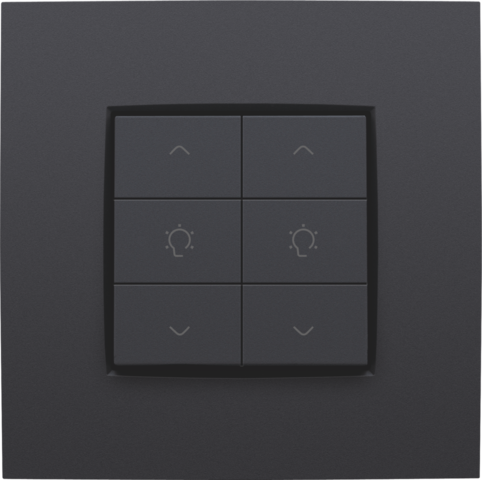 De tweevoudige dimbediening heeft twee groepen van drie actieknoppen. Hiermee kan de bewoner twee lichtpunten of twee groepen lichtpunten op- of neerdimmen. Je bevestigt de drukknop op de muurprint via een klikmechanisme.