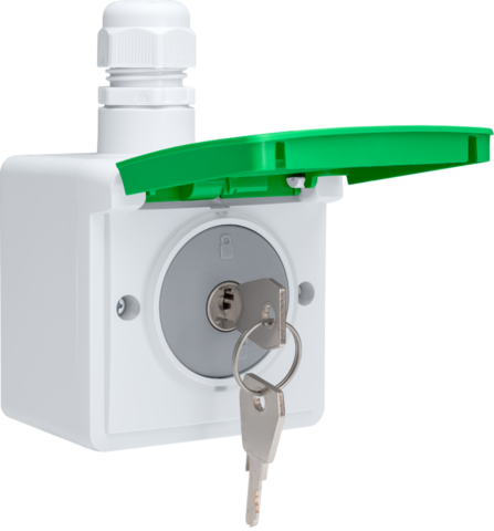 Het stopcontact is eveneens voorzien van een beschermklep met scharnieren en is gemonteerd in een enkelvoudige spuitwaterdichte opbouwdoos met één M20-ingang met wartel. Kleurcombinatie: lichtgrijs met groene beschermklep.