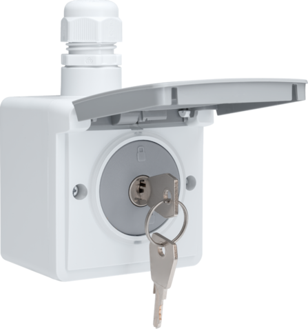 Het stopcontact is eveneens voorzien van een beschermklep met scharnieren en is gemonteerd in een enkelvoudige spuitwaterdichte opbouwdoos met één M20-ingang met wartel.