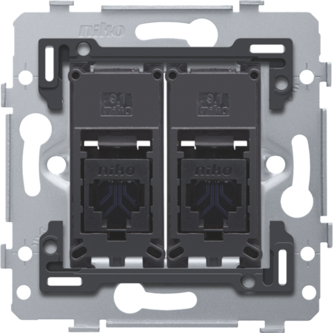 Ten mechanizm z 2 punktami przyłączeniowymi RJ45 UTP Kat. 6, służy do utworzenia połączenia sieciowego z 2 urządzeniami do zastosowań telefonicznych, ethernetowych, IP lub internetowych. Każdy punkty przyłączeniowy mechanizmu jest podłączony w konfiguracji gwiazdy do centralnej szafki przyłączeniowej za pomocą kabla o takim samym typie wydajności. Ramka do montażu podtynkowego ma wymiary wewnętrzne 45 x 45 mm i wymiary zewnętrzne 71 x 71 mm i jest mocowana za pomocą mocowanie za mocowanie śrubowe. Zestaw wykończeniowy i ramkę zewnętrzną w wybranym kolorze należy zamówić osobno.