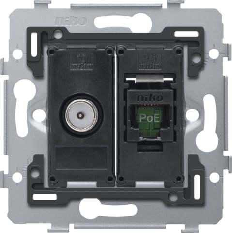 Mechanizm z punktem przyłączeniowym RJ45 UTP Kat. 6 i połączeniem koncentrycznym. Punkt przyłączeniowy RJ45 UTP Kat. 6 służy do utworzenia połączenia sieciowego do zastosowań telefonicznych, ethernetowych, IP lub internetowych. Wszystkie punkty przyłączeniowe mechanizmu są podłączone w konfiguracji gwiazdy do centralnej szafki przyłączeniowej za pomocą kabla o takim samym typie wydajności. Ramka do montażu podtynkowego ma wymiary wewnętrzne 45 x 45 mm i wymiary zewnętrzne 71 x 71 mm i jest wyposażona w mocowanie śrubowe. Zestaw wykończeniowy w wybranym kolorze należy zamówić osobno.