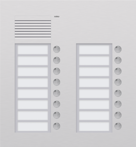 Táto ultra plochá jednotka so zápustnou montážou je zakončená hliníkom s hrúbkou 3 mm a veľmi jednoducho sa dá namontovať do steny alebo priečky. Vonkajšia jednotka má proti manipulácii zabezpečenú 5 mm hrubú menovku z plexiskla. Tieto pokovované tlačidlové kontakty si nevyžadujú žiadnu údržbu a sú veľmi odolné. Táto vonkajšia jednotka používa 2-vodičovú techniku, čo znamená, že už existujúci zvonček jednoducho nahradíte podobnou vonkajšou jednotkou. Vonkajšia jednotka obsahuje montážnu krabicu (na zapustenú montáž). Táto vonkajšia jednotka má 16 zvončekov. Pri 12 zvončekoch sú tlačidla zvončekov zoradené do dvoch radov a pri 24 zvončekoch do troch radov.