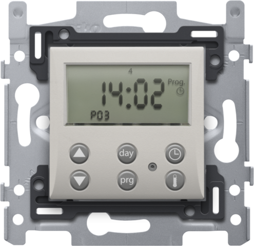Digitálny termostat s hodinami s inteligentným ovládaním a so zapínacím kontaktom, 1 A, 230 V, je ideálny na ovládanie teploty. Termostat obsahuje denný a týždenný program a trvalú pamäť. Má elektroinštalačné prvky a pripevňuje sa skrutkami. Rámček je potrebné objednať samostatne. Farba povrchovej úpravy: light grey.