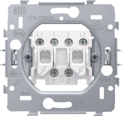 Mechanizmus pre dvojnásobný dvojsmerný spínač s rozperkami. Dvojsmerné spínače sa používajú na ovládanie osvetlenia z dvoch rôznych miest. Stredový kryt a rámček vo farbe podľa vášho výberu musíte objednať samostatne.
