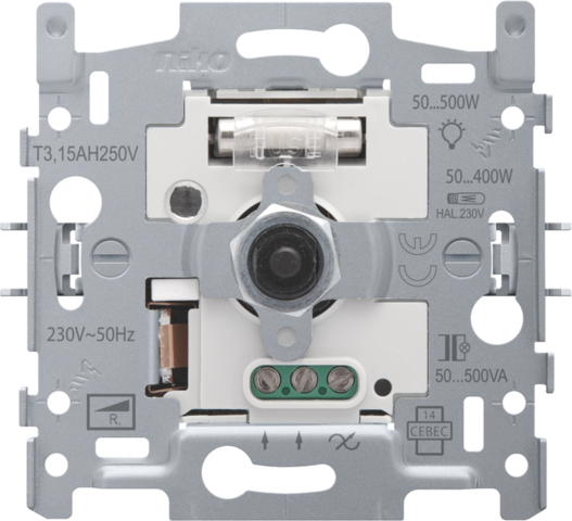 Prístrojový spodok pre otočný stmievač s kapacitou 500 VA. Kryt XXX-31000 a rámček vo farbe podľa vášho výberu musíte objednať samostatne.