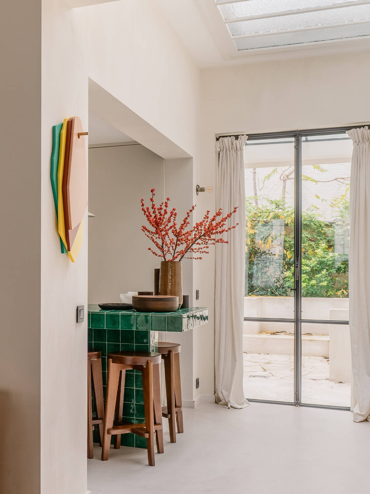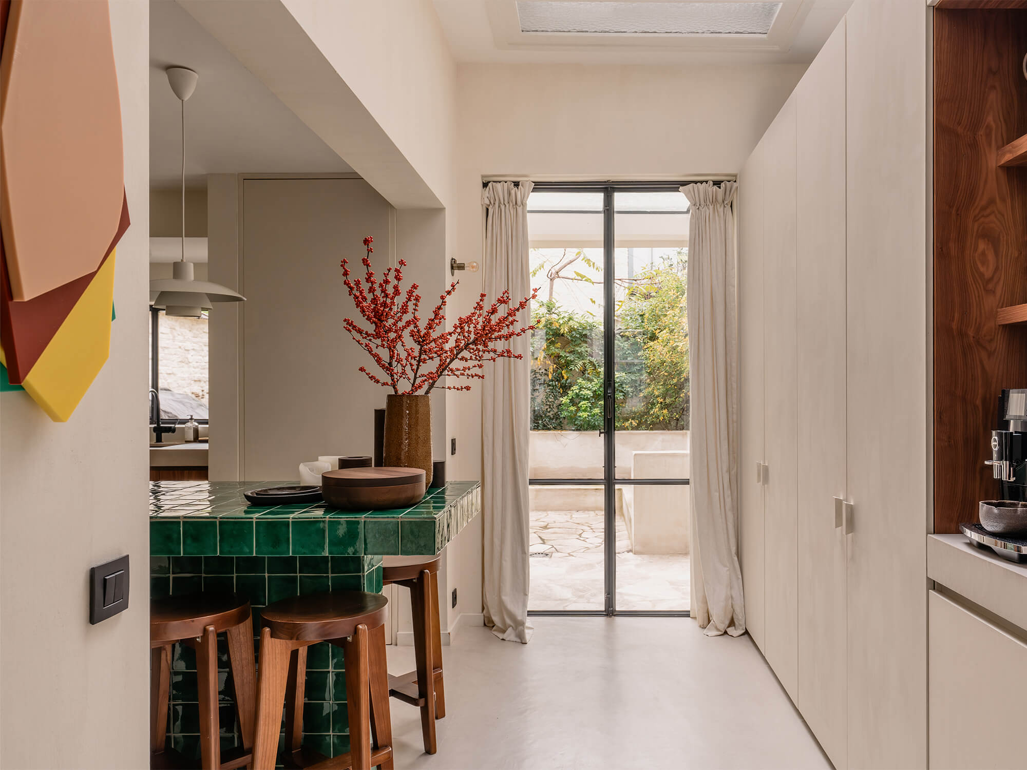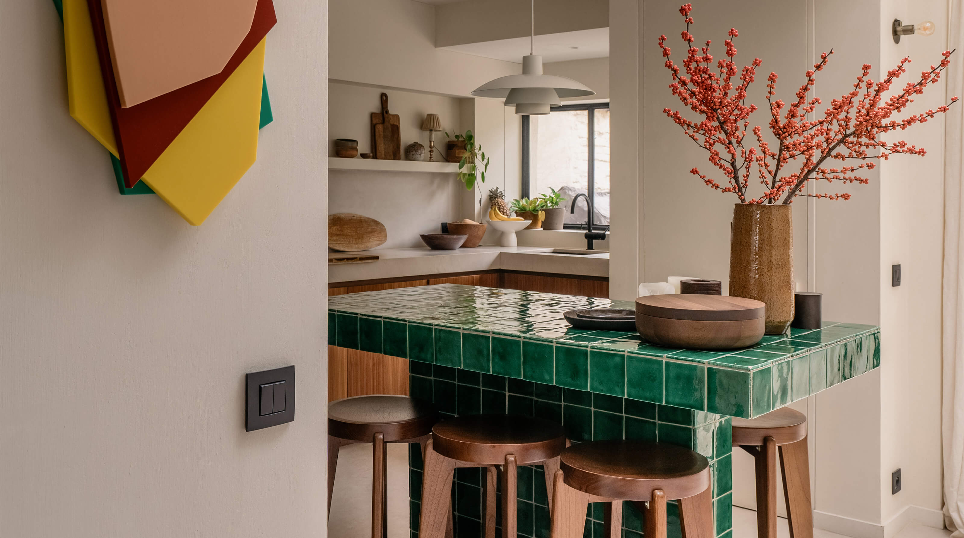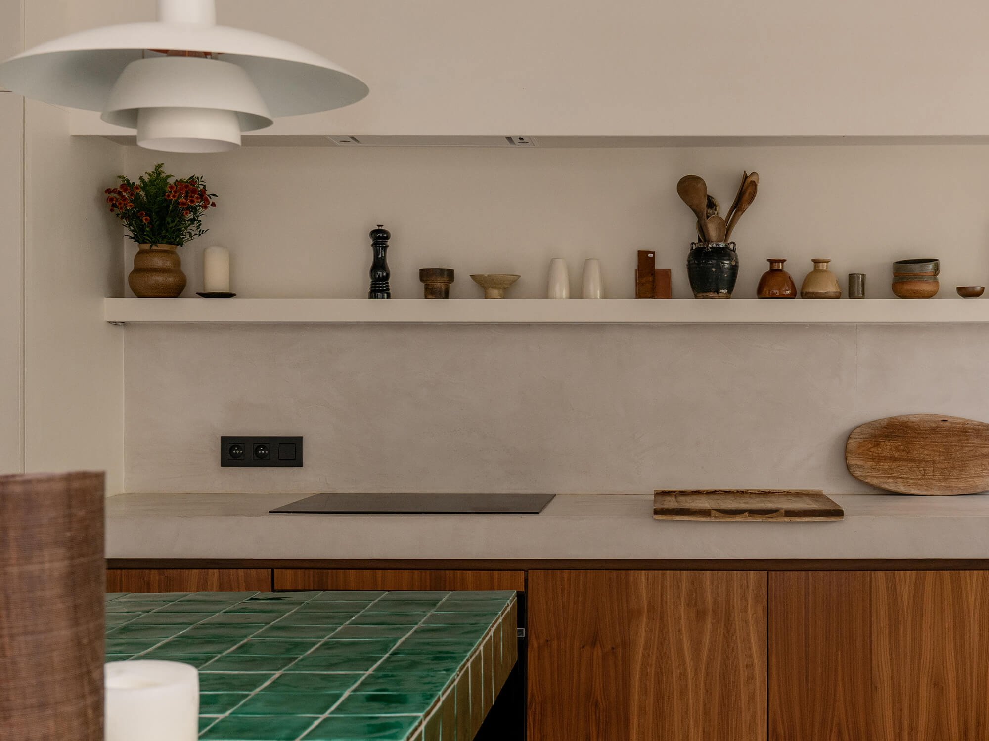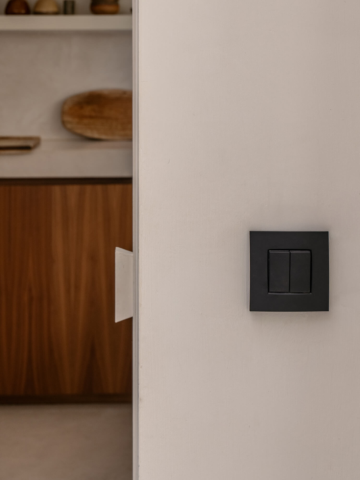 Interiérový štýl Jill spája nadčasovosť a útulnosť, s jemným nádychom osobitosti. Jeho pútavým prvkom sú napríklad tmavozelené dlaždice, orechová dyha a farba, ktorá odhaľuje jemné hĺbky priestoru. „Použili sme prevažne teplé, prírodné materiály, ako je orechové drevo, mäkké tkaniny a farby s výraznou štruktúrou, ktoré vytvárajú pocit pokoja a kontinuity,“ hovorí Jill. Tento pokoj sa odráža aj v jemných detailoch interiéru. „Rada Niko Intense matt black coated je čistá a minimalistická, nenápadne dopĺňa interiér. Výborne ladí s našimi čiernymi svietidlami a čiernymi batériami, čím vytvára pokojný a súdržný celok.“