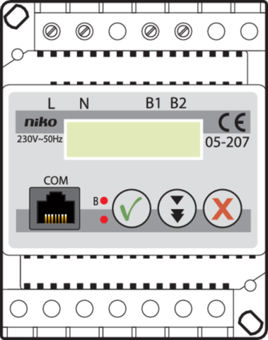 This module connects the feedback keys of the touchscreen with the Nikobus installation. In an installation, one feedback module is needed per 24 feedback keys or per touchscreen. Per installation, a maximum of 5 feedback modules can be used. The module is programmed using the PC.
