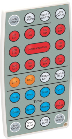 Denna Niko-fjärrkontroll används för att ställa in närvarosensorer (360°, 230 V, master) med en kanal för infälld montering (350-20070) och för ytmontering (350-20078) via IR. Fabriksinställningarna kan ändras med fjärrkontrollen. Inställningarna som kan ändras inkluderar dagsljusvärdet (lux-värde) och den tid som belysningen förblir påslagen.